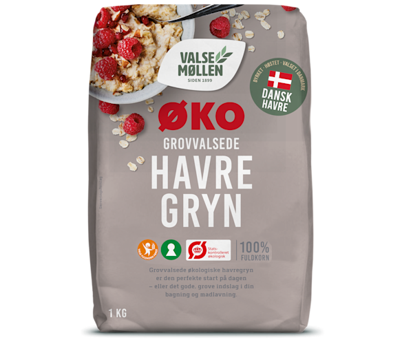 Valsemøllen Økologiske Havregryn er dyrket efter bæredygtige økologiske metoder uden kemi og kunstgødning. Derfor er økologi et godt sted at starte, når du gerne vil gøre en forskel – både for naturen, dig selv og din familie. Økologiske havregryn fra Valsemøllen er det perfekte morgenmåltid, fordi det giver en god start på dagen med vitaminer, mineraler og en god mæthedsfornemmelse fra de vigtige kostfibre. Nyd dem med mælk som havregryn eller i en müsli. Prøv også havregryn i madlavningen, fx til panering, sunde snacks eller til at give hjemmebagte brød og boller ekstra grovhed, smag og fylde. Havregryn er en nem vej til fuldkorn og fibre, fordi havregryn er 100 % fuldkorn. Fødevarestyrelsen anbefaler mindst 75 g fuldkorn om dagen som en del af en varieret kost. Produktet indeholder 100 g fuldkorn pr. 100 g. Valsemøllen Økologiske Havregryn passer godt ind i en balanceret kost og en sund livsstil. Valsemøllen Økologiske Havregryn indeholder betaglucan – en naturlig fiber, der har vist sig at sænke kolesterolindholdet i blodet.Et højt kolesterolindhold i blodet øger risikoen for udvikling af hjertekarsygdomme. For at få en positiv virkning på kolesterolværdien bør man indtage 3 g betaglucan hver dag. En portion grovvalsede havregryn (40 g) indeholder ca. 1,3 g betaglucan.