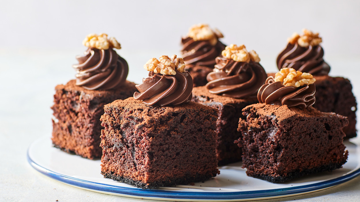 Afpyntning Skær kagen ud i ønsket størrelser og sprøjt creme på toppen. Pynt med f.eks. kakaopulver og valnødder