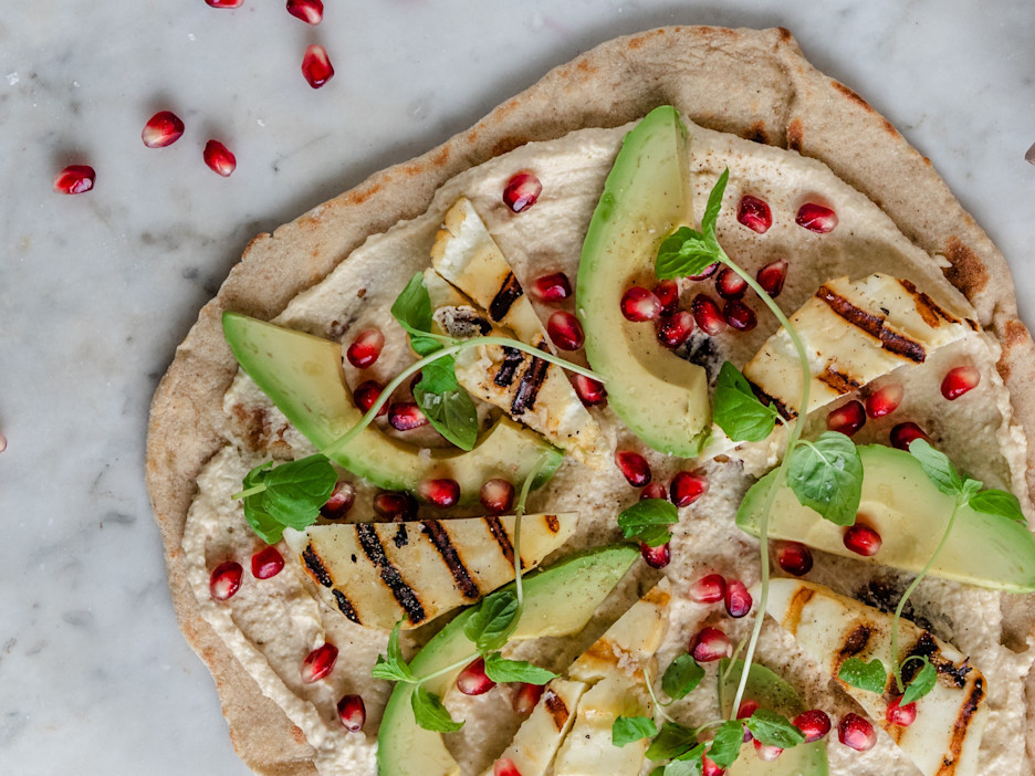 Smør hvert fladbrød med hummus, top med stegt halloumi, avocadoskiver, granatæblekerner og mynte. Krydr med salt og peber.