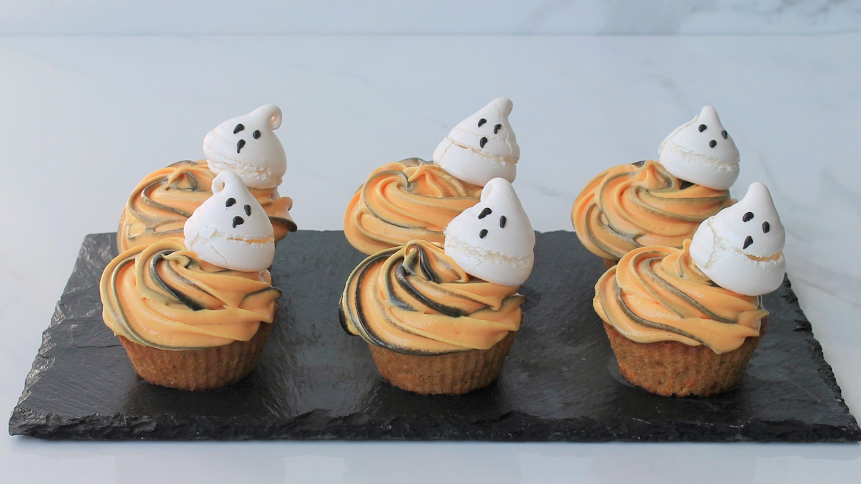 Bag flotte og smagfulde halloweengulerodsmuffins til din halloween fejringen. Halloween nærmer sig, og traditionen tro, betyder det uhyggelig udklædning, pynt og søde sager. Disse lækre halloweenmuffins vil sørge for, at der er god, (u)hyggelig, halloweenstemning hos jer. Opskriften giver dig en klassisk gulerodsmuffin, som er lavet med en sort og orange cremecheese-frosting, der passer perfekt til halloween. Derudover byder opskriften også på marengsspøgelser, som I kommer ovenpå jeres muffins.