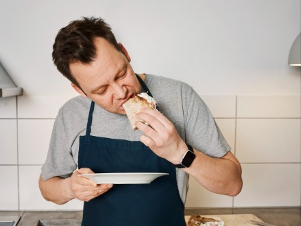 Åben ”Sandwichen”, smør pistacie pesto på, kom mortadella i og fordel en halv burrata i hver af sandwich.