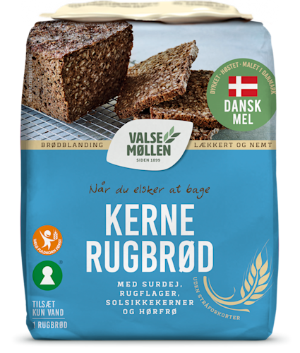 Valsemøllen Kernerugbrød er fyldt med solsikkekerner og hørfrø. Kombinationen af frø og kerner tilsat rugsurdej giver et saftigt rugbrød med god smag og flotte skiver. Vi har blandet melet, kerner og surdejen for dig – det kalder vi hjemmebag på den nemme måde! Du går hverken på kompromis med smag, kvalitet eller bageglæden. Resultatet er et lækkert saftigt rugbrød med god smag, godt bid og flotte skiver. Perfekt til alt fra morgenmaden, frokostbordet og den ekstra gode madpakke. Der medfølger gær på toppen. Brødblandingen giver 1 stort rugbrød (2,6 l). Se opskriften her. Tip: brødblandingen kan også bruges til lækre rugsnacks. Fødevarestyrelsen anbefaler 90 g fuldkorn om dagen og gerne mere som en del af en varieret kost. Produktet indeholder 32,5 g fuldkorn pr. 100 g. brød, når det tilberedes efter opskriften.