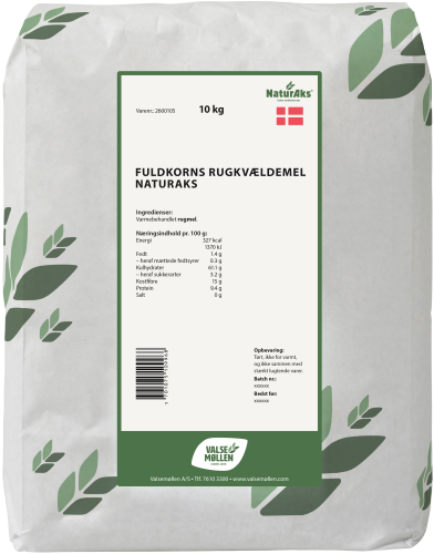 Fuldkorn Rug Kvældemel NaturAks, DK er er et 100% fuldkornsprodukt og kan derfor bære fuldkornsmærket. Kvældmelet giver en bedre vandoptagelse i brødet og sikrer en længere friskholdning. Dosering: 10 gram rugkvældemel pr. 1.000 gram færdig rugbrødsdej. Fødevarestyrelsen anbefaler 90 gram fuldkorn om dagen og gerne mere som en del af en varieret kost. Produktet indeholder 100 gram fuldkorn pr. 100 gram. Fuldkorn Rug Kvældemel NaturAks, DK er mærket med Dansk Mel og Valsemøllens NaturAks®, hvilket betyder, at du får et produkt af ekstra god kvalitet, dyrket høstet og malet i Danmark. I vores NaturAks® koncept har vi håndplukket landbrugene, og vi følger kornet og melet løbende helt fra jord til bord, for at sikre den høje kvalitet. NaturAks® er samtidig din garanti for, at kornet er dyrket uden brug af stråforkorter og roundup.