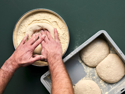 Form pizzaerne med hænderne gennem en bevægelse, der går fra midten og ud til kanterne, mens du presser med fingrene. Top med ønsket fyld, lidt men godt.