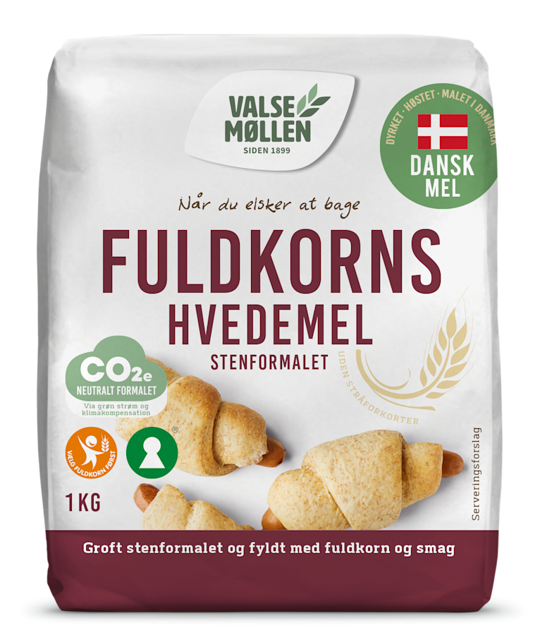 Valsemøllen fuldkornshvedemel er groft stenformalet og 100% fuldkorn. Det giver et fyldigt bagværk med en grovere struktur og masser af smag.